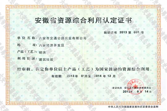 安徽省資源綜合利用認(rèn)定證書(shū)